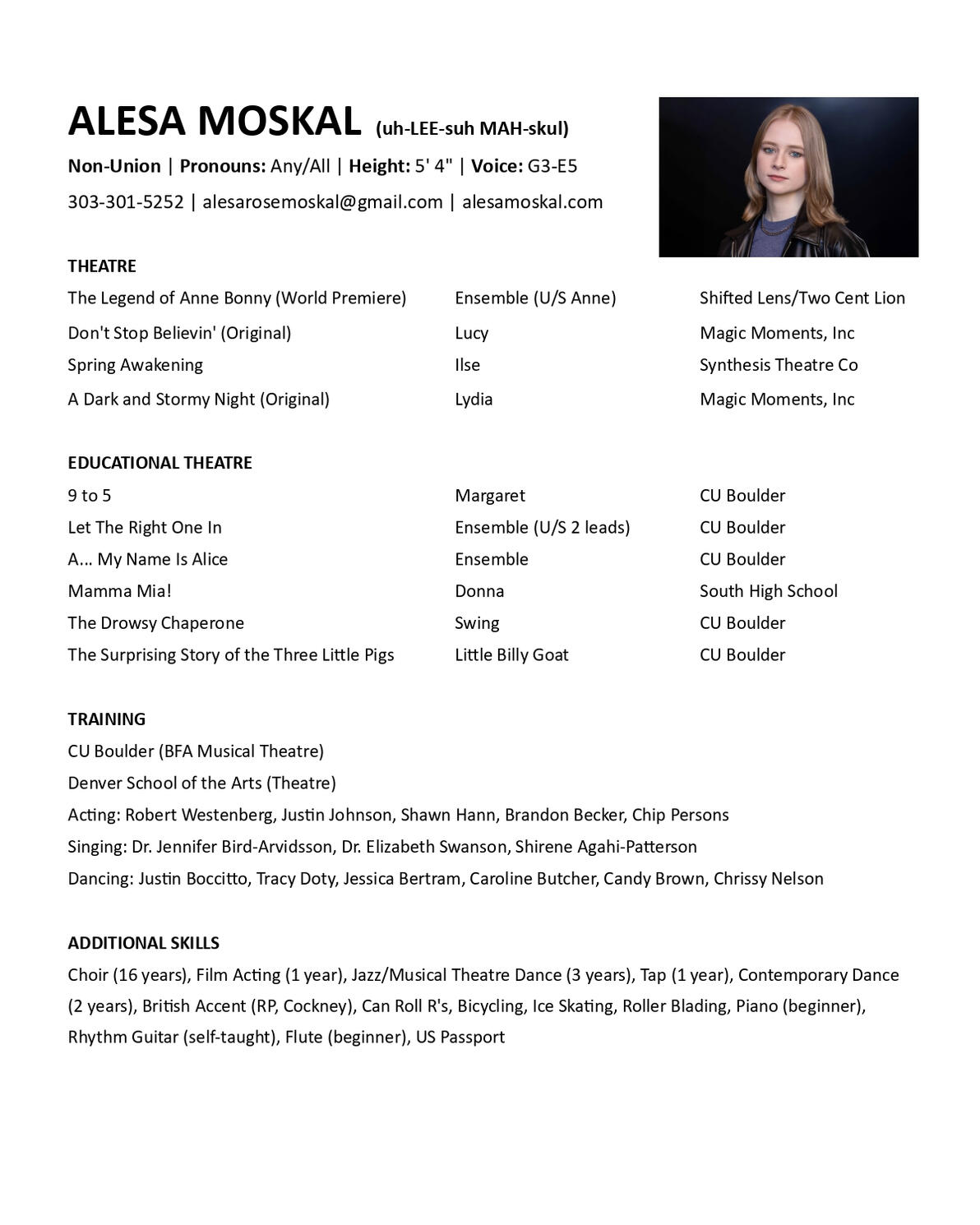 I like to consider myself a light switch. When I feel or love something, I feel and love it with every inch of my body and everything else fades away. When I don't, well, you couldn't make me care less. There is no middle ground.For me, being consumed so strongly by the things I love led to a lonely childhood. After all, who wants to be friends with someone who can't put their interest away long enough to have a conversation? I grew up feeling like I didn't "belong" anywhere...Until I found the theatre at age 6. I discovered quickly that musicals could perfectly channel my intense emotions and light-switch personality. Spending hours on end deep-diving into the mind of fictional characters, learning and practicing lines, music, and choreography was right up my alley, while performing in front of crowds of people and hearing their applause gave me the attention I craved. I knew that this was where my future lied.Over the course of my young life, my love of musical theatre has expanded to many different performance areas including plays, choir, dance, songwriting, guitar, and even fronting an 80s metal cover band for a short time. With everything I do, I am to share stories in performance through the lens of joy, belonging, and purpose, which it has brought to my own life, and I hope to inspire these qualities in others who might need them like I did.When I'm not performing, you can find me at a Colorado Avalanche game, a Def Leppard concert, watching Star Wars, or hanging out with my cats and family.
